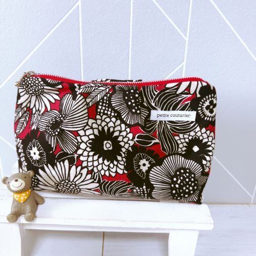 【受注作成】プレゼントに最適 ふっくらタックポーチ(アジアンフラワーレッド)