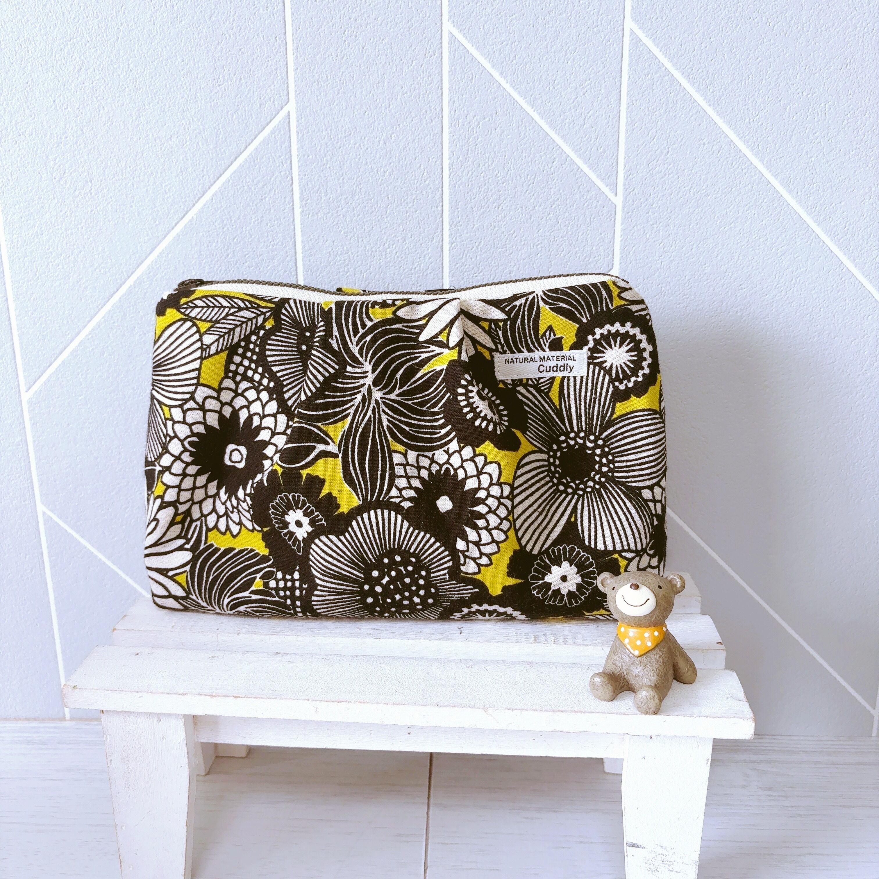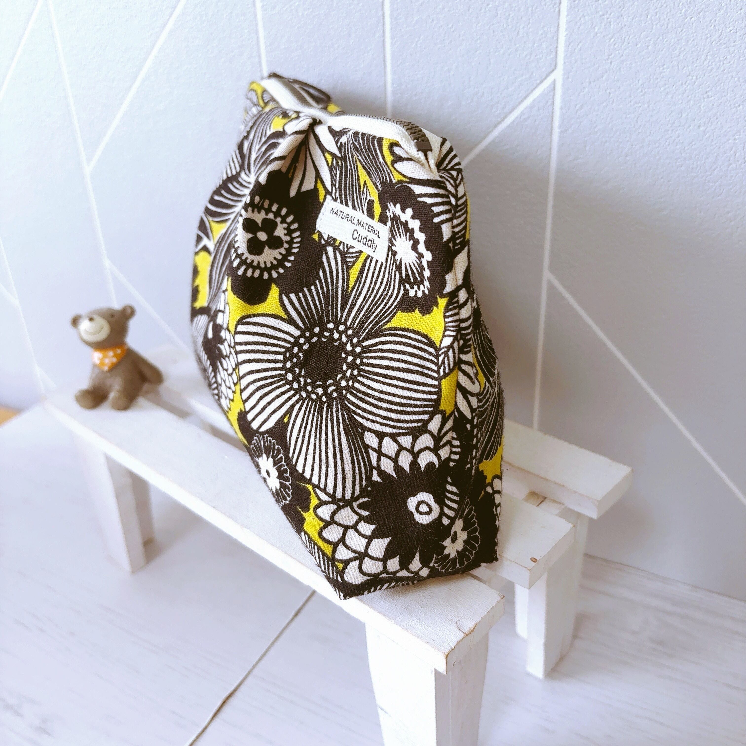 表はコットン、黄色地に黒のアジアンフラワー、芯をはりしっかり自立します。