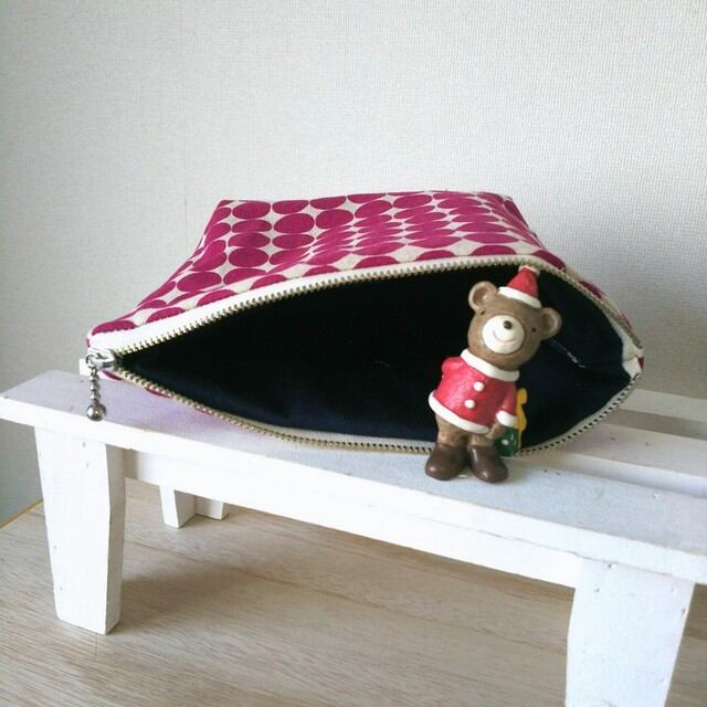 ベーシックなポーチです。大きさは、縦14㌢、横21㌢、まち7㌢です。
