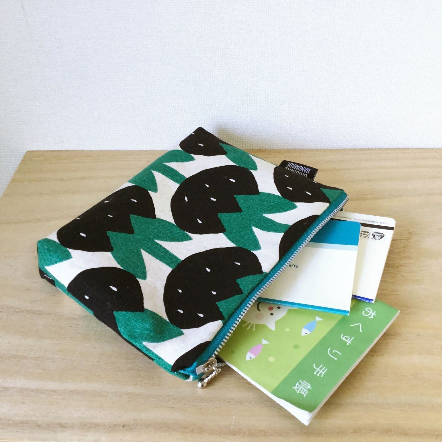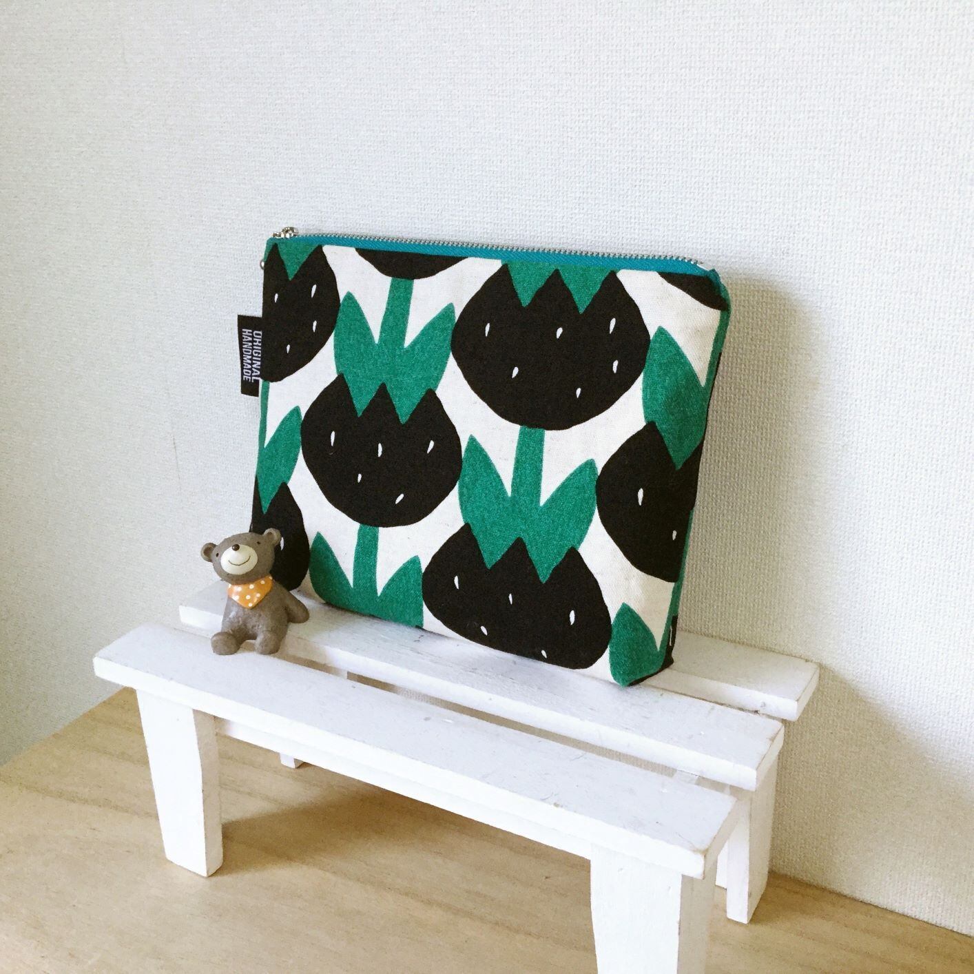 【受注作成】薄型台形ポーチ(グリーン×ブラックチューリップ)
