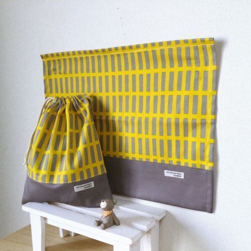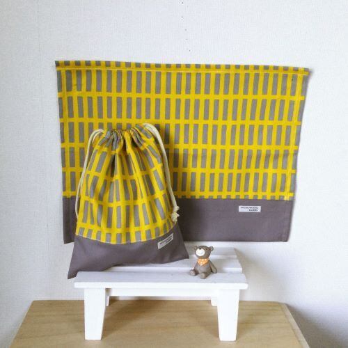 【祝入園入学準備】給食袋、ナフキンセット(北欧調グレー×黄色四角)