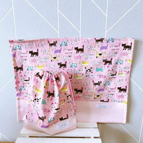 【受注作成】入園入学 給食袋、ランチョンマットセット(ピンク猫)