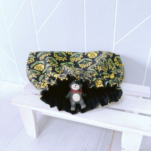 優しいブラックのすみくろ地に黄色のミモザが咲き誇る、春を感じるバネ口ポーチです。サイズは縦15cm、横15cm、まち7cmとコンパクトながらも、しっかりと自立する黒帆布の裏地が小物をしっかり守ります。しなやかなバネ口は、固すぎずスムーズな開閉を実現しており、日常使いにぴったりです。