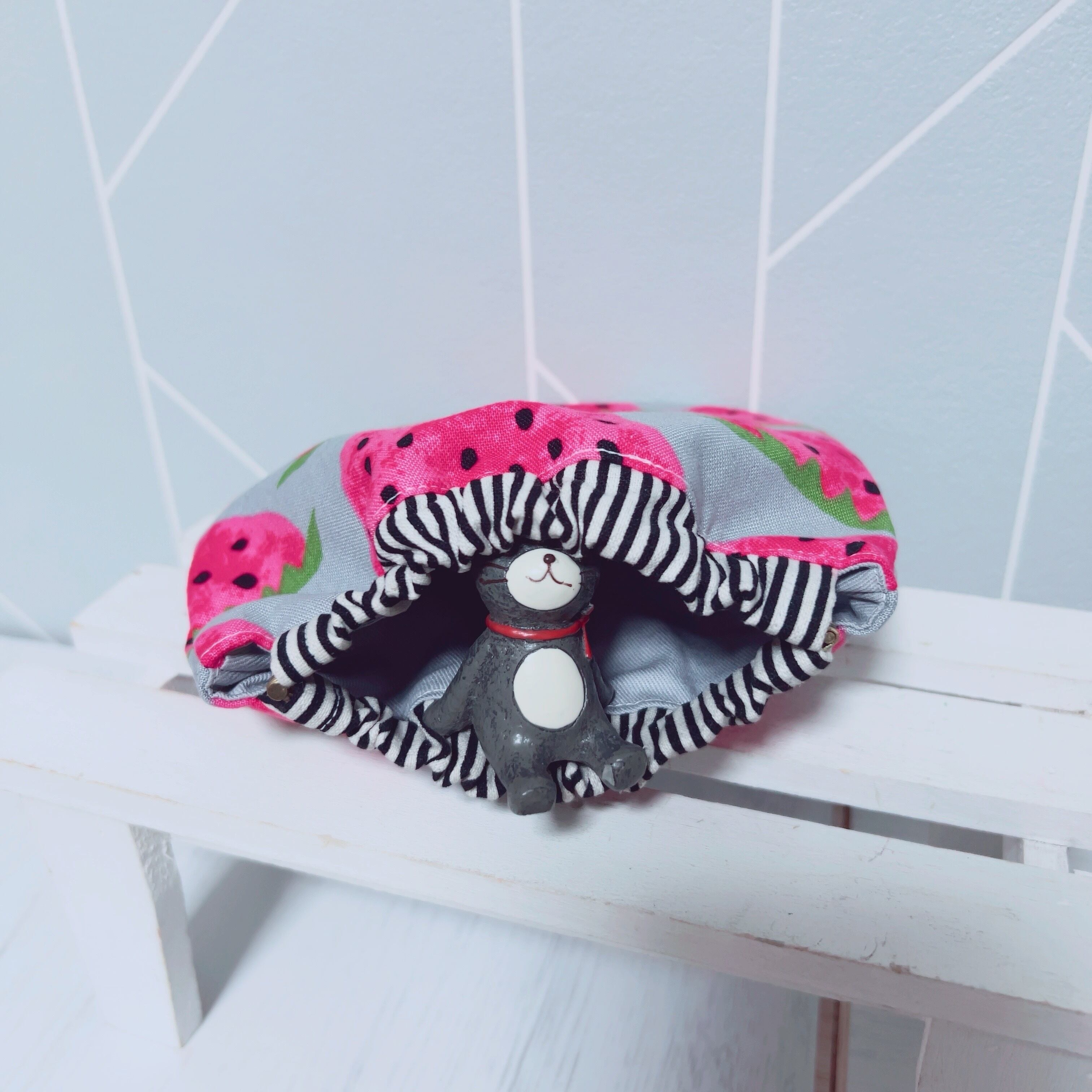 表はしっかりしたコットンのイチゴ柄、裏は明るい水色のコットンです。
