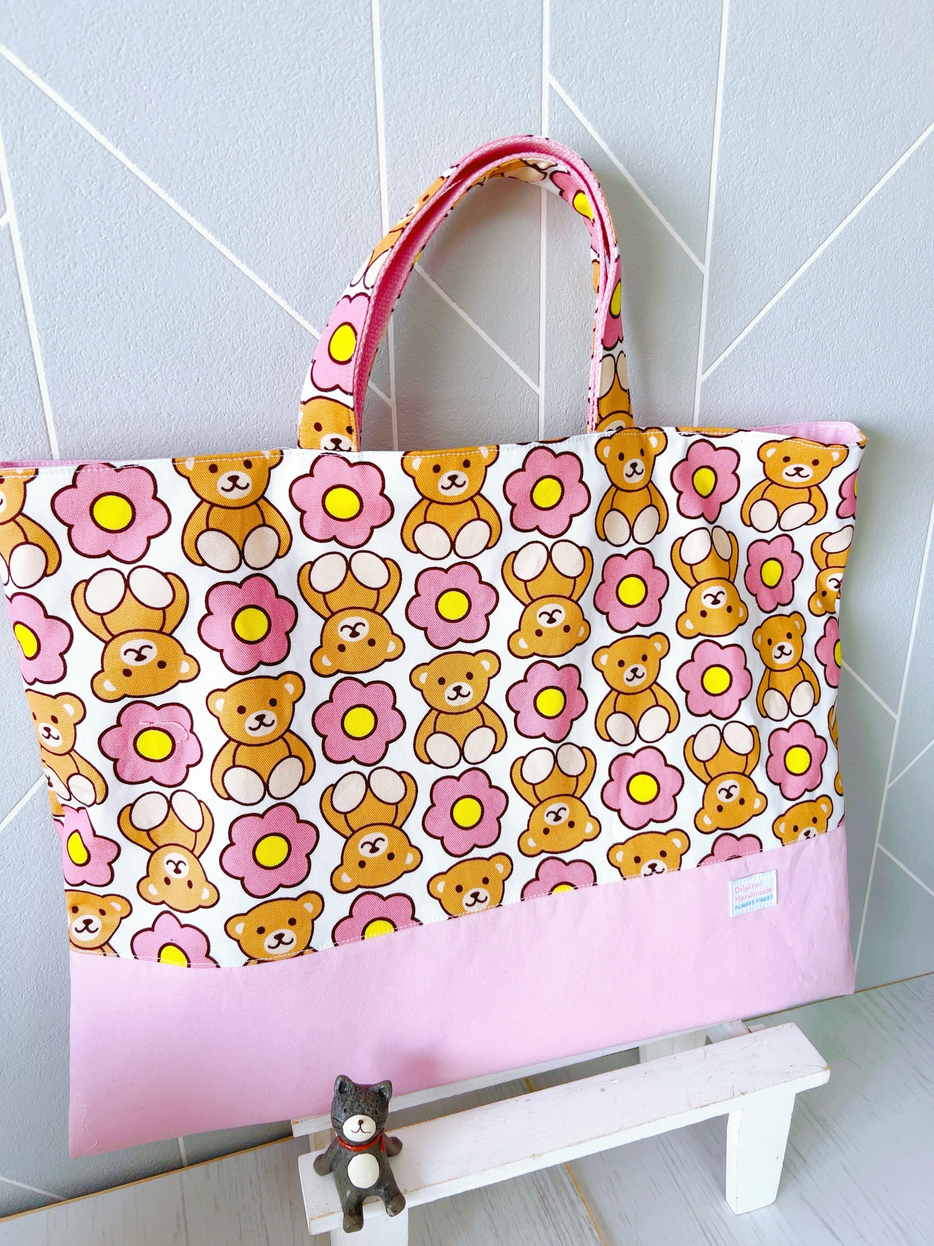 明るいピンクを基調にした、キュートなくま柄が特長のレッスンバッグです☆ お子様が入園や入学を迎える大切な瞬間に、ピッタリなアイテムとしてお勧めします。大きなサイズ感で、たっぷりと収納できるので学校の教材やお着替え、絵本などさまざまなアイテムを楽々持ち運べます。