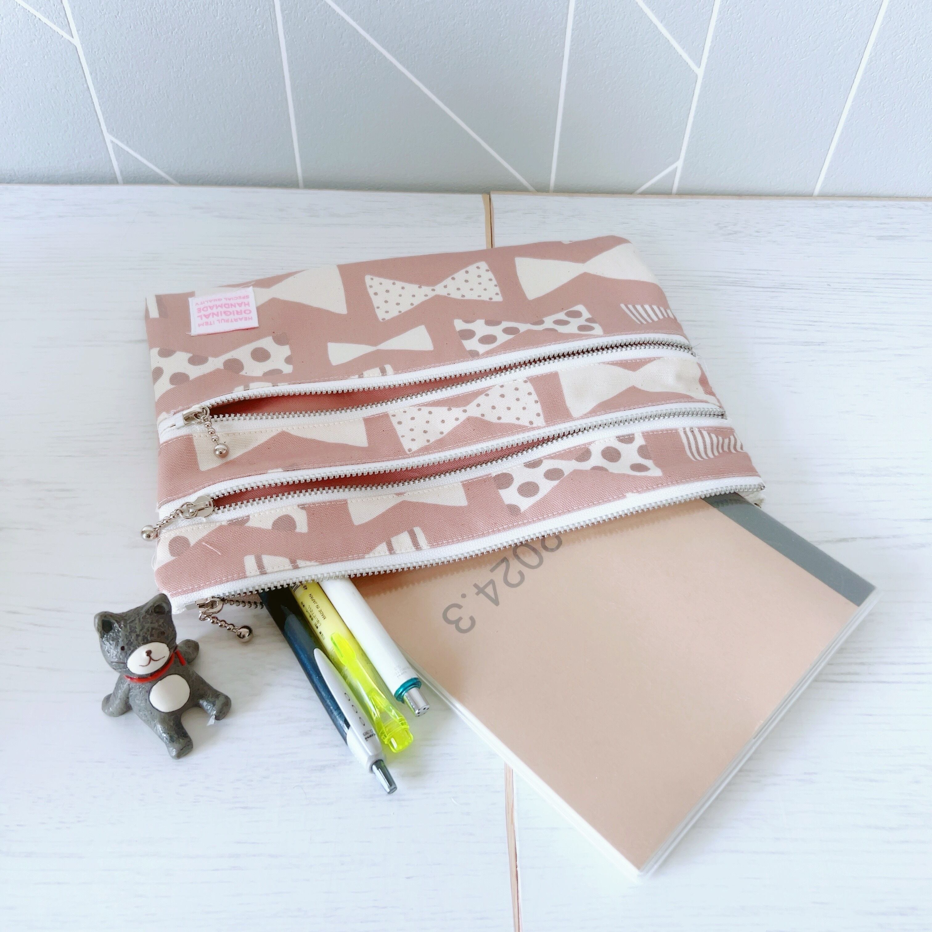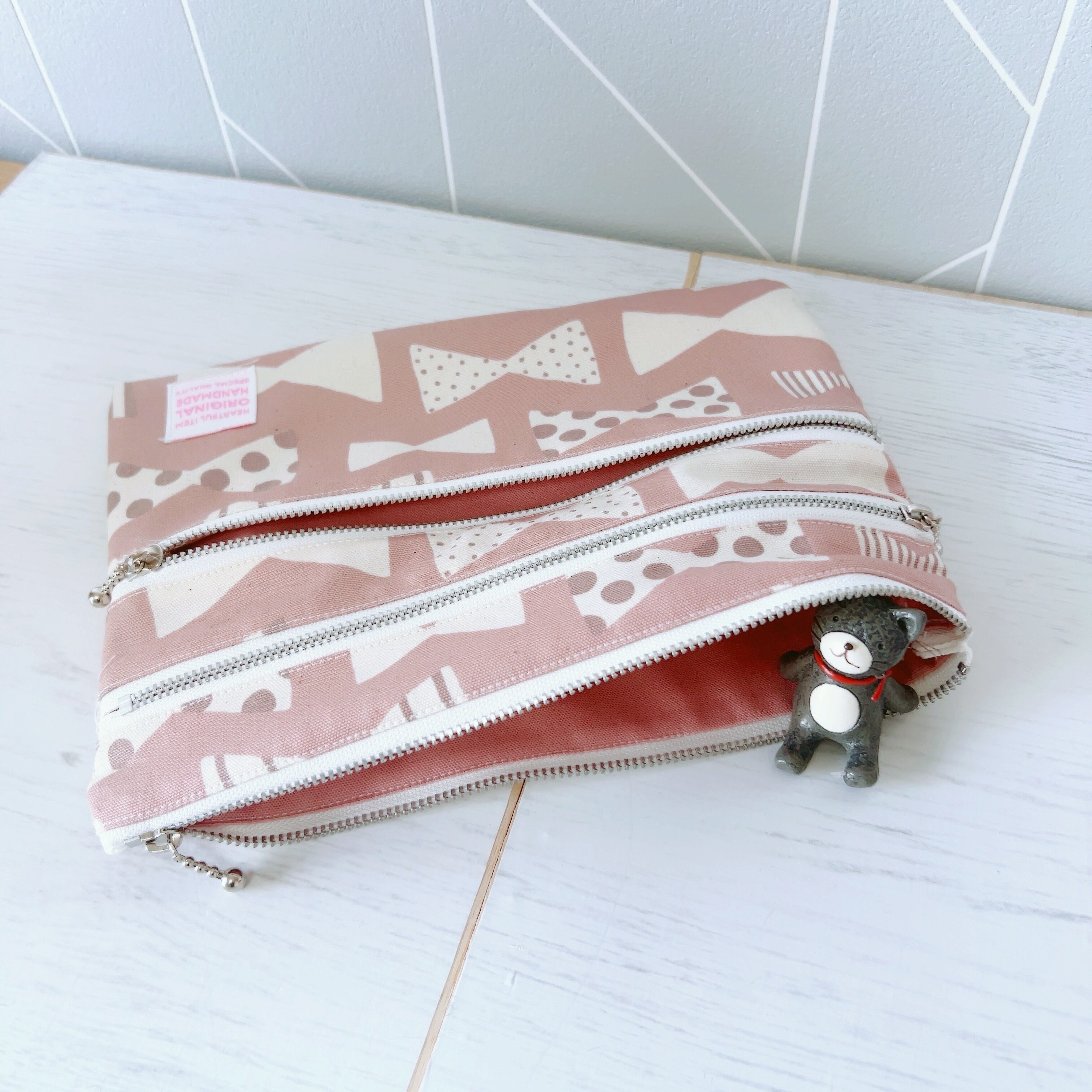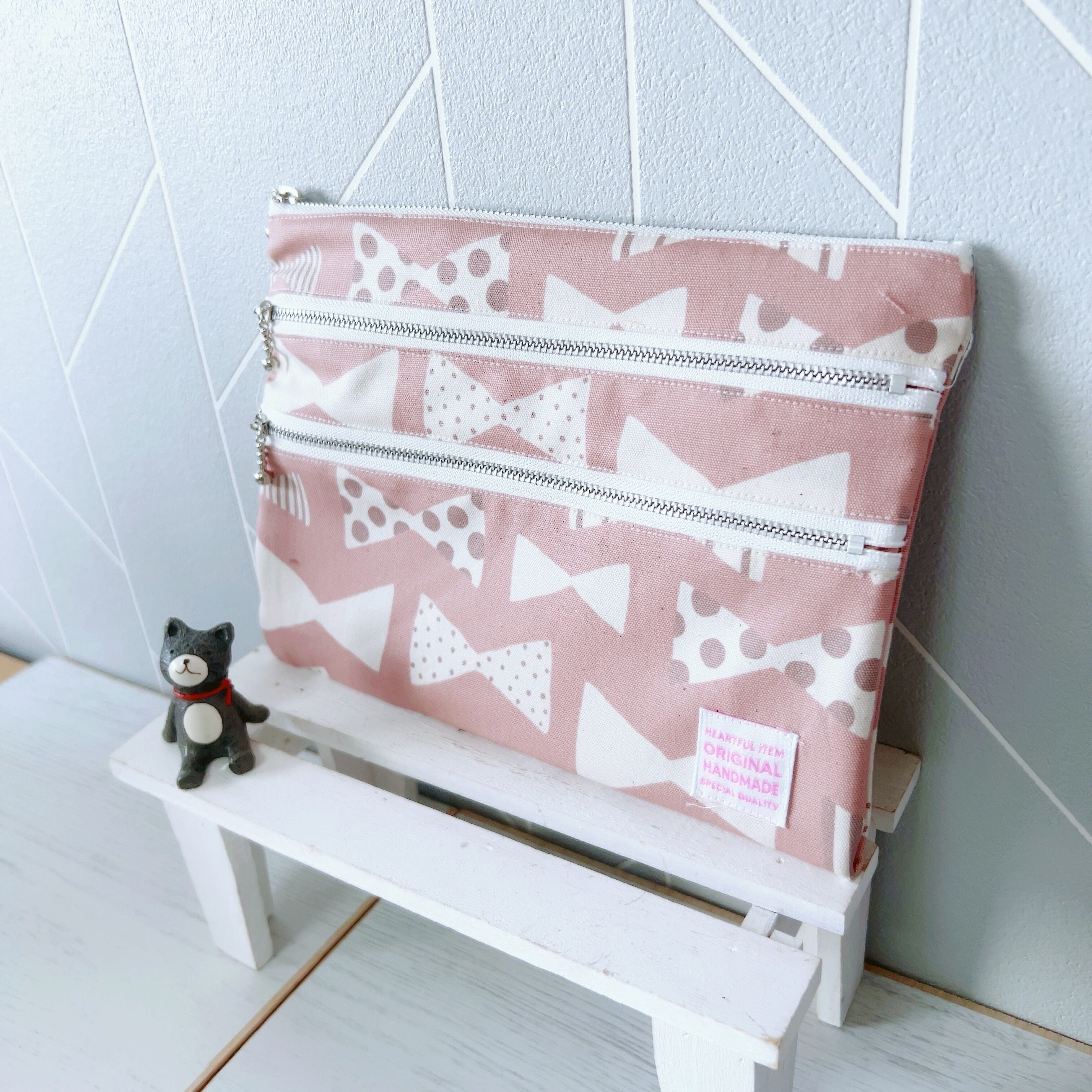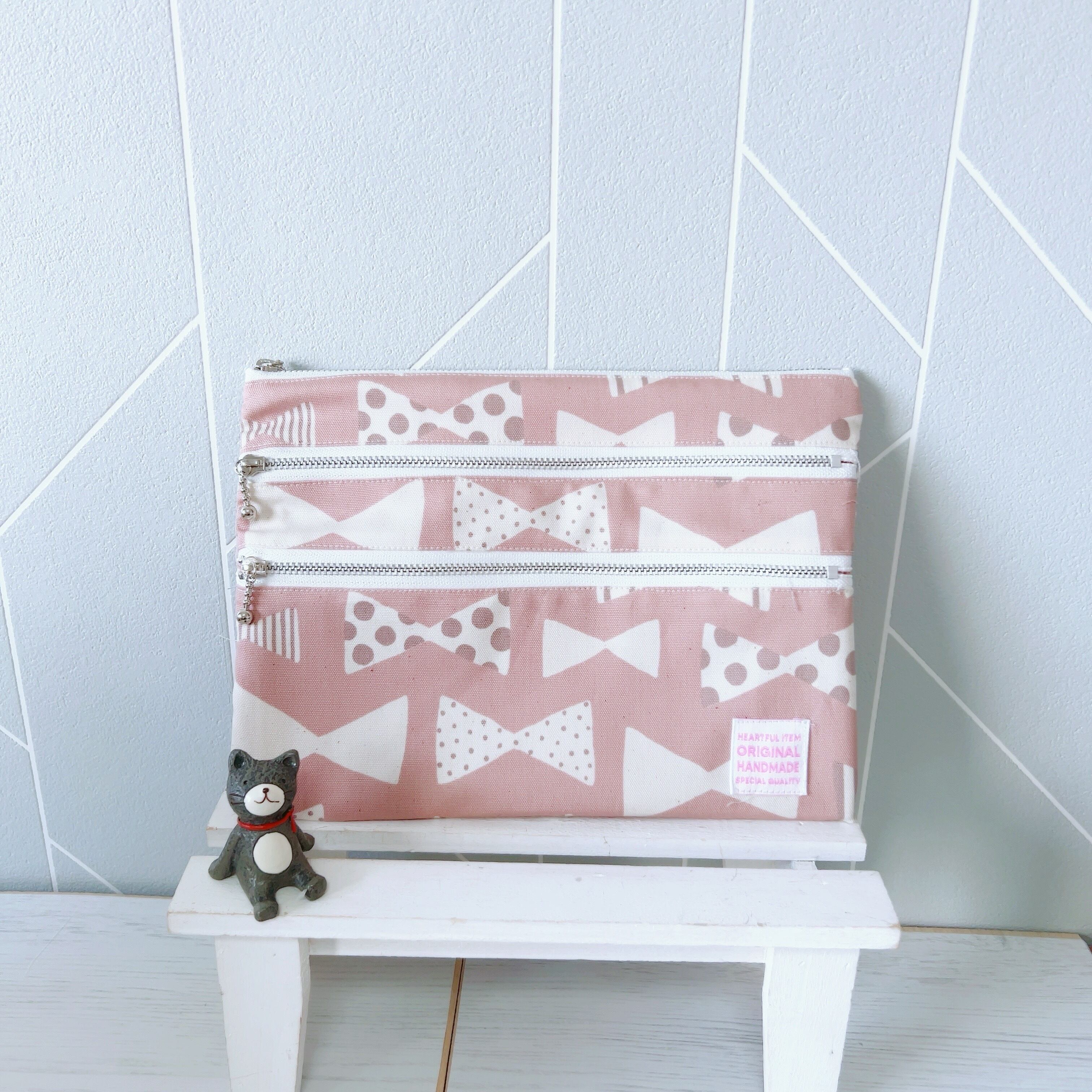 【受注作成】3ファスナーポーチ(ピンクリボン)